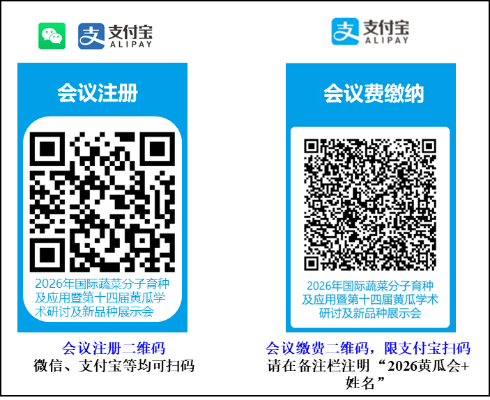 请参会代表通过“支付宝”扫描“会议费缴纳”二维码缴纳会议费,务必准确填写单位全称、纳税人识别号和电子邮箱等信息,并在备注栏注明“2026黄瓜会+姓名”。如多人合并缴费,请附上所有人员姓名。中国园艺学会会员需在“备注”栏额外备注会员登记号,发票将按照每笔缴费金额开具,并以电子发票的形式发送至注册邮箱。