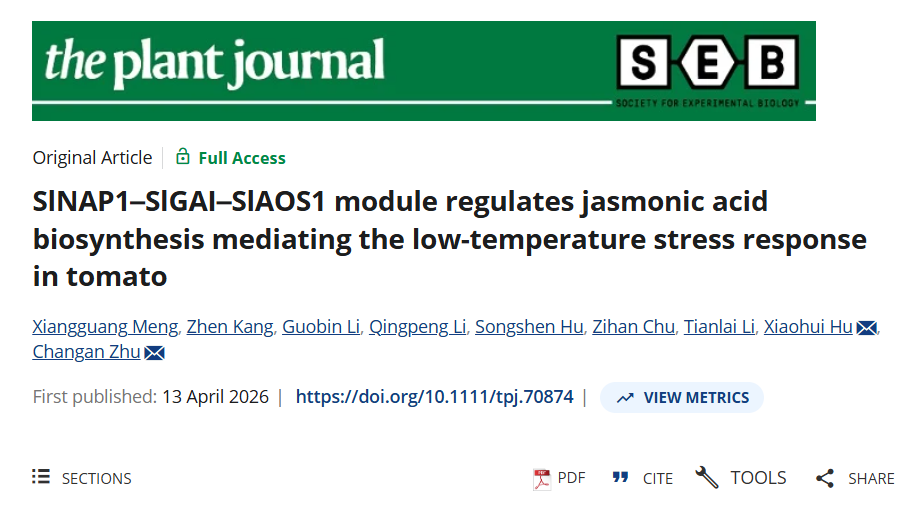 近日,园艺学院设施农业生物与环境工程研究团队胡晓辉教授、朱常安教授课题组在《The Plant Journal》发表题为SlNAP1–SlGAI–SlAOS1 module regulates jasmonic acid biosynthesis mediating the low-temperature stress response in tomato的研究论文。该研究系统解析了NAC转录因子与DELLA蛋白协同调控茉莉酸生物合成、提升番茄低温耐性的分子通路,为番茄耐低温分子育种提供关键靶点与理论支撑。