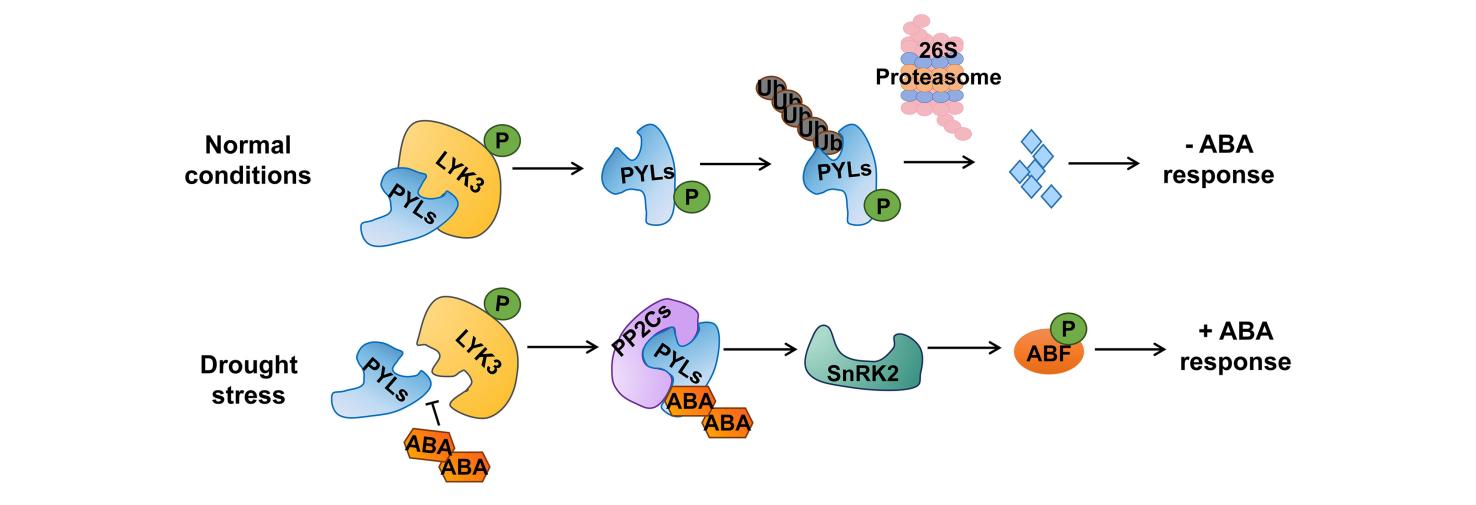近日,我院苹果抗逆与品质改良创新团队马锋旺教授/刘长海教授课题组在New Phytologist上发表了题为“LysM receptor-like kinase MdLYK3 destabilizes the ABA receptors PYR/PYLs to suppress ABA signaling in apple” 的研究论文,该研究发现苹果中的LysM受体激酶MdLYK3能够直接与植物激素脱落酸(ABA)的多种受体结合并将其磷酸化,磷酸化后的ABA受体会经泛素-蛋白酶体途径降解,从而负向调控苹果的抗旱能力。有趣的是,苹果中存在一种“双重保险”机制:当干旱来临,ABA大量积累时,高浓度的ABA会削弱 MdLYK3与ABA受体之间的相互作用,保护其受体不被过度降解,从而确保抗旱信号通路得以持续、有效地运行。