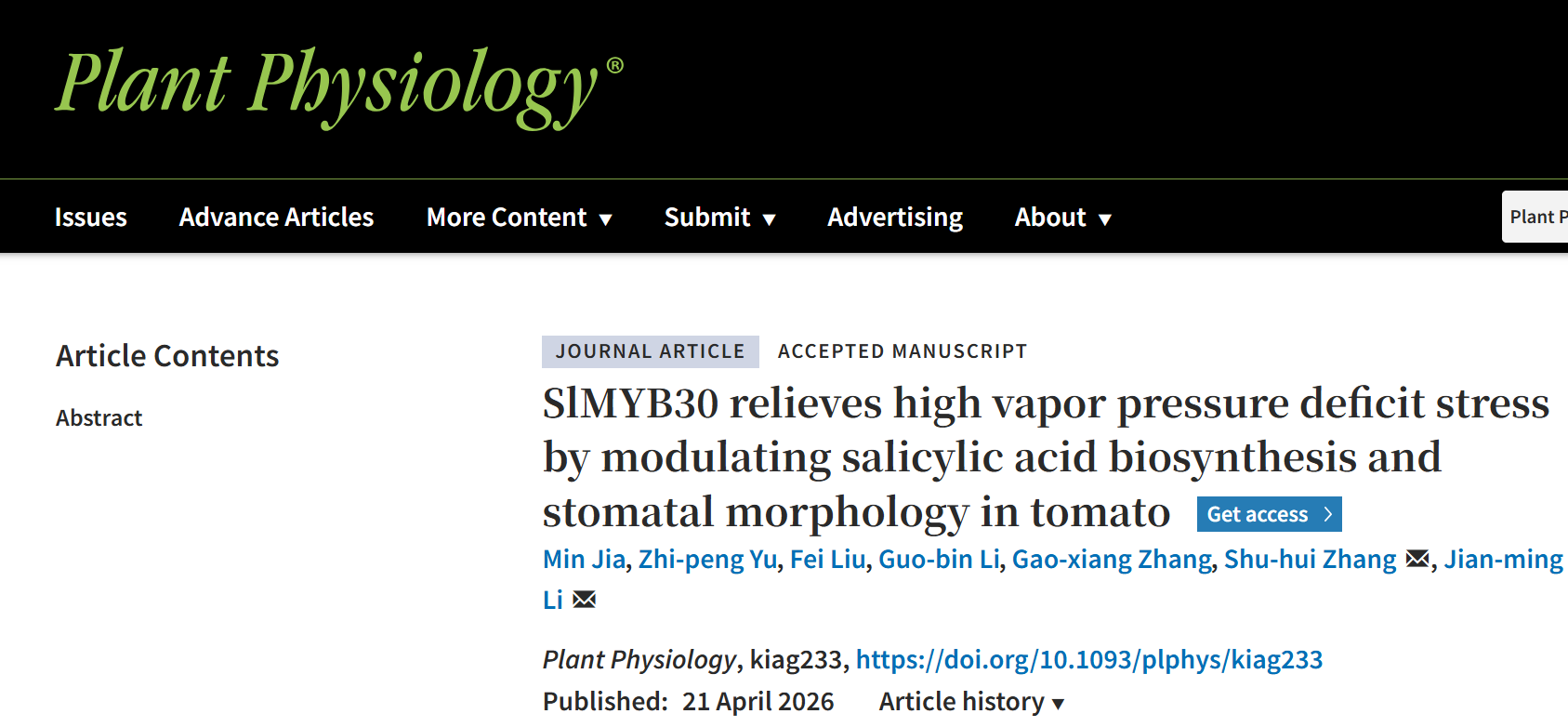 近期,我院李建明教授和张淑辉副教授团队在期刊《Plant Physiology》在线发表题为“SlMYB30 relieves high vapor pressure deficit stress by modulating salicylic acid biosynthesis and stomatal morphology in tomato”的研究论文,揭示了番茄SlMYB30通过水杨酸合成通路与水孔蛋白SlPIP1;7协同调控,增强植株对高水汽压差胁迫抗性的分子机制,为培育抗逆作物、应对全球气候变化下的农业生产与水资源管理提供了新的理论依据和基因靶点。