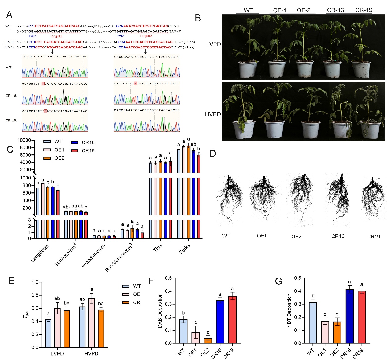 一定温度下,大气饱和蒸气压与实际蒸气压之间的差值被称为饱和水汽压差(vapor pressure difference, VPD),它可以用来估算大气干旱程度。高VPD通常意味着空气较为干燥,这会对植物的生理过程产生系列影。高VPD胁迫通过急剧攀升的蒸腾耗水引发植物体内水分与碳代谢失衡,导致气孔持续关闭下的“碳饥饿”与氧化崩溃,造成细胞不可逆损伤甚至植株死亡;其与全球气候变暖、干旱协同的“复合效应”正加速农田与自然生态系统的崩溃,严重威胁全球粮食安全与生态稳。联合国粮农组织指出,极端气候事件频发已导致全球四大主粮作物严重减产,而番茄(Solanum lycopersicum L.)作为年产值超千亿美元的重要经济作物,其产量与品质对高VPD胁迫尤为敏感。然而,目前关于番茄响应高VPD胁迫的分子调控网络仍存在重大缺口,尤其是关键转录因子如何整合激素信号与生理调控机制以增强抗逆性,亟待深入解析。